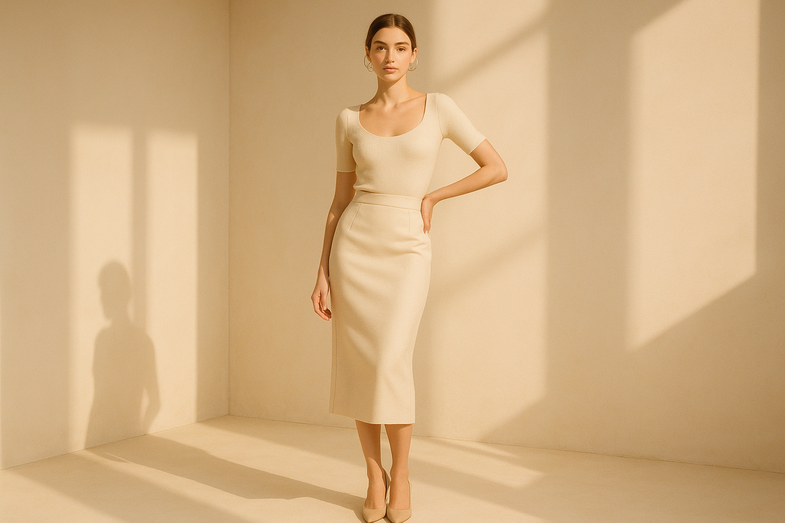 The version that's working isn't the rigid, structured skirt of the late 90s boardroom. It's a little softer. Midi length. Often in neutral tones - black, cream, warm camel. Worn with a simple knit top or a thin crewneck sweater rather than a blazer.